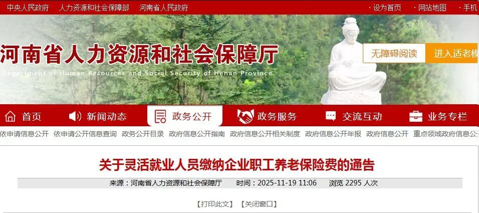 为切实保障全省广大灵活就业人员社保权益,现就灵活就业人员缴纳企业职工养老保险费有关事项通告如下:一、及时缴纳养老保险费按照国家有关规定,灵活就业人员2025年度缴费时间截至2025年12月31日结束,提醒广大灵活就业人员在规定时限内完成2025年度养老保险费缴纳。逾期未缴费的,按照规定不得跨年度补缴,将会影响缴费年限、退休待遇水平等个人权益。二、完成缴费基数补差自2025年7月1日起,全省社会保险费缴费基数以6385元/月确定个人缴费基数上下限,缴费基数下限为3831元(60%),缴费基数上限为19155元(300%)。目前税务系统已根据2025年缴费基数上下限调整标准,产生7月—10月社保缴费差额,提醒灵活就业人员于2025年12月31日前完成社保缴费差额的补缴工作,以免影响个人权益。退休待遇水平遵循“长缴多得、多缴多得”的原则,缴费年限长短、缴费金额高低,直接关系到未来退休待遇水平。我们诚挚建议广大灵活就业人员积极参保缴费,为未来幸福晚年生活打下坚实基础!如有疑问,可向当地税务部门、社保经办机构咨询,或拨打12366(税务咨询)、12333(社保咨询)热线电话详询。河南省人力资源和社会保障厅国家税务总局河南省税务局2025年11月19日