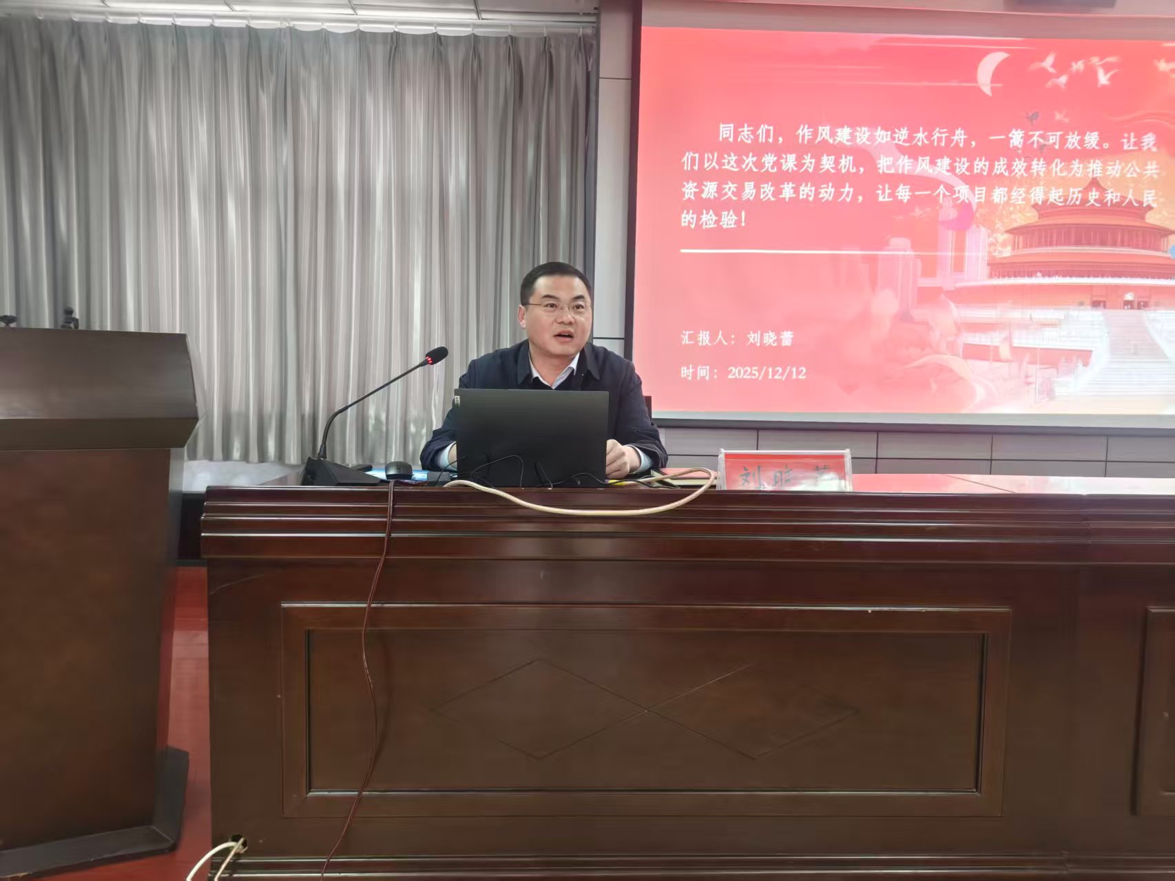 讲座中,刘晓蕾结合中心工作实际,以“深化作风建设,筑牢廉洁防线”为主题,从时代内涵再领悟、实践成效大盘点、正视挑战强作风、警钟长鸣知敬畏、靶向发力再出发等五个方面展开讲解,既回顾了中心在减流程、降成本、全流程电子化等方面的亮点成绩,也直面平台全覆盖、交易管理、监管协同等突出问题,更针对性提出“学、改、干、严”四字举措。