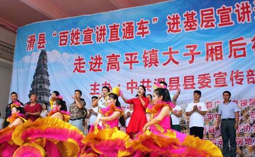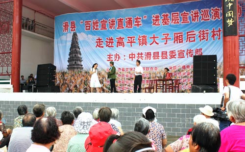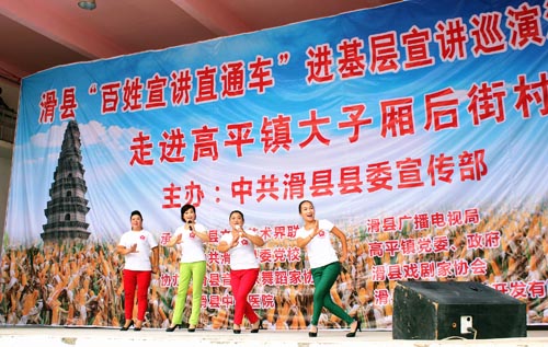 据了解,此次巡演活动以“信仰、信心、信任”为主题,围绕“两学一做”学习教育,采用“文艺搭台、理论唱戏”的形式,引导全县理论和文艺工作者,走进基层、深入群众,用百姓喜闻乐见的艺术形式,把党的创新理论成果向群众讲清楚、说明白,推动理论宣传更好地扎根基层、服务群众,进一步深化广大干部群众对中国特色社会主义、“中国梦”的认知认同,为打赢脱贫攻坚战、建设“富强文明、和谐美丽、幸福宜居”新滑州提供思想保证和精神动力。(图/时昌宁)
