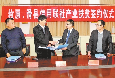 毛敢杰(左二)在与牧原企业签订产业扶贫项目 本报记者邓放摄
