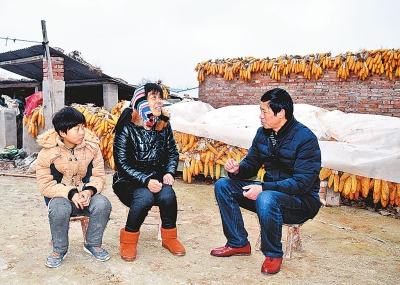 王冰(右一)与贫困户家庭成员交谈 本报记者邓放摄