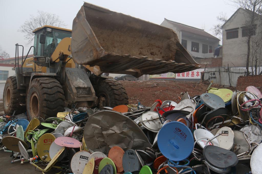 会前,我县对查处收缴的2000余套非法卫星地面接收设施进行了集中销毁。