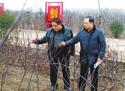 余志国(右)在花木种植园了解情况 本报记者邓放摄