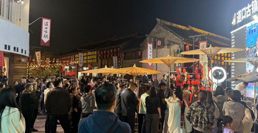 夜幕降临,滑县道口古镇运河两岸灯火辉煌,水幕电影的光影在水面上跳跃,如梦如幻,景区大舞台上,精彩的演艺轮番登场,热闹非凡。