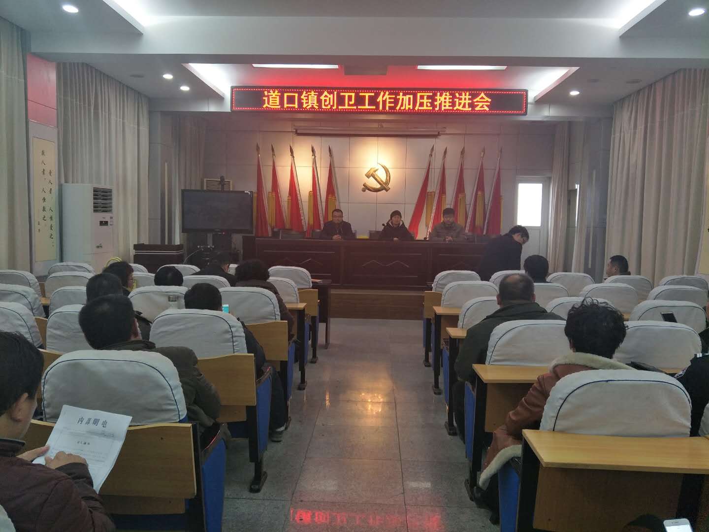 为扎实推进创卫工作,12月16日下午,道口镇组织镇机关全体、各村支部书记在四楼会议室召开创卫工作加压推进会。