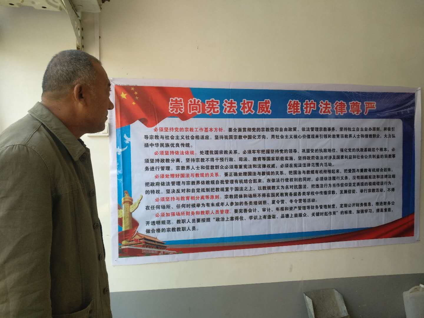 三是营造宣传氛围。由镇宗教管理办公室组织人员在宗教活动场所悬挂国旗、教唱国歌,并制作一批“社会主义核心价值观”、《宪法》、《宗教事务条例》为主题的宣传标牌悬挂到各个宗教场所的显要位置,积极主动推进社会主义核心价值观进场所、入人心。