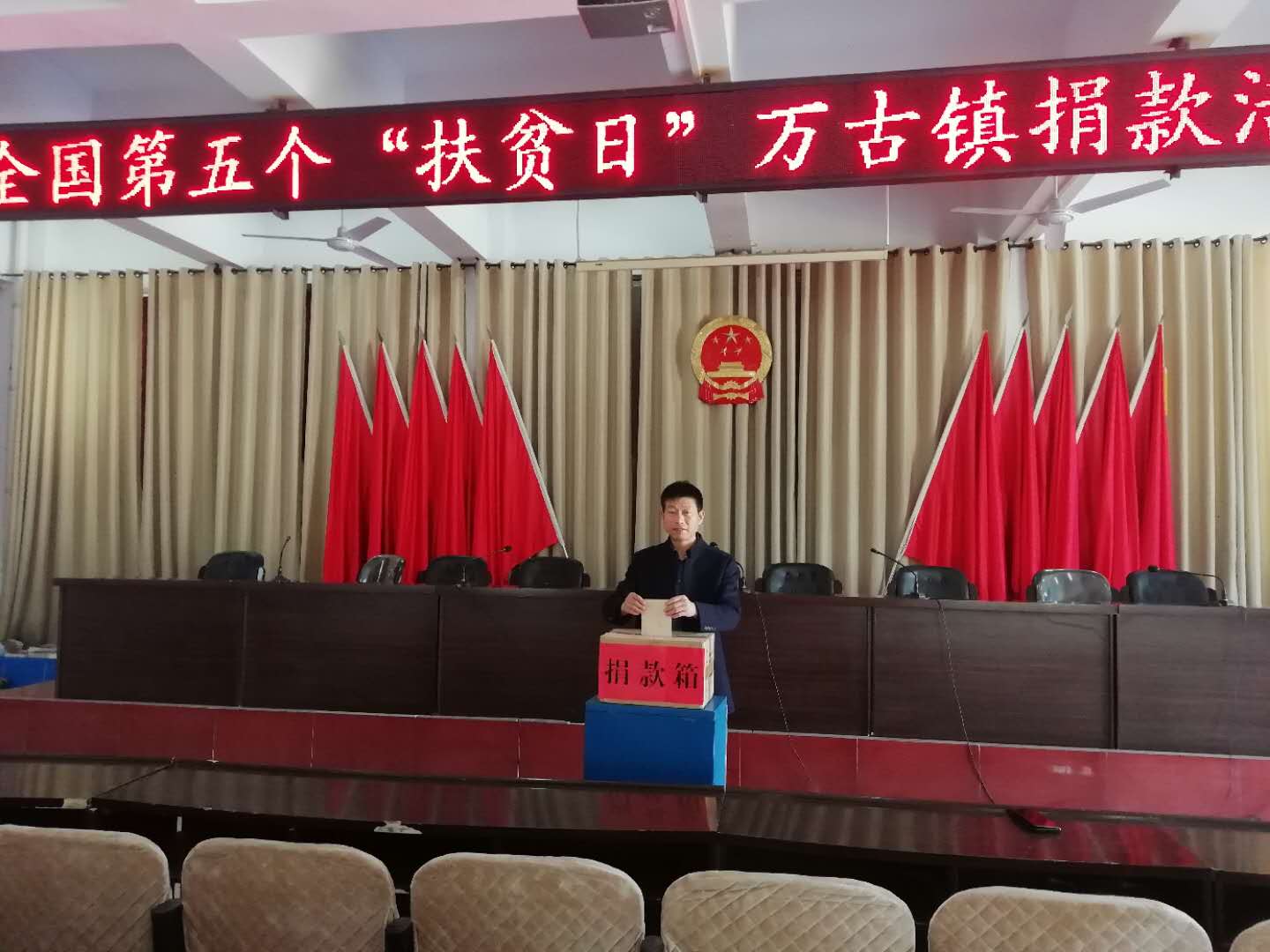 10月17日,在第五个全国扶贫日来临之际,万古镇党委积极响应上级党委倡议,组织全镇机关干部在一楼大会议室开展扶贫日捐款活动,镇党委书记韩伟锋带领全镇干部参加活动。