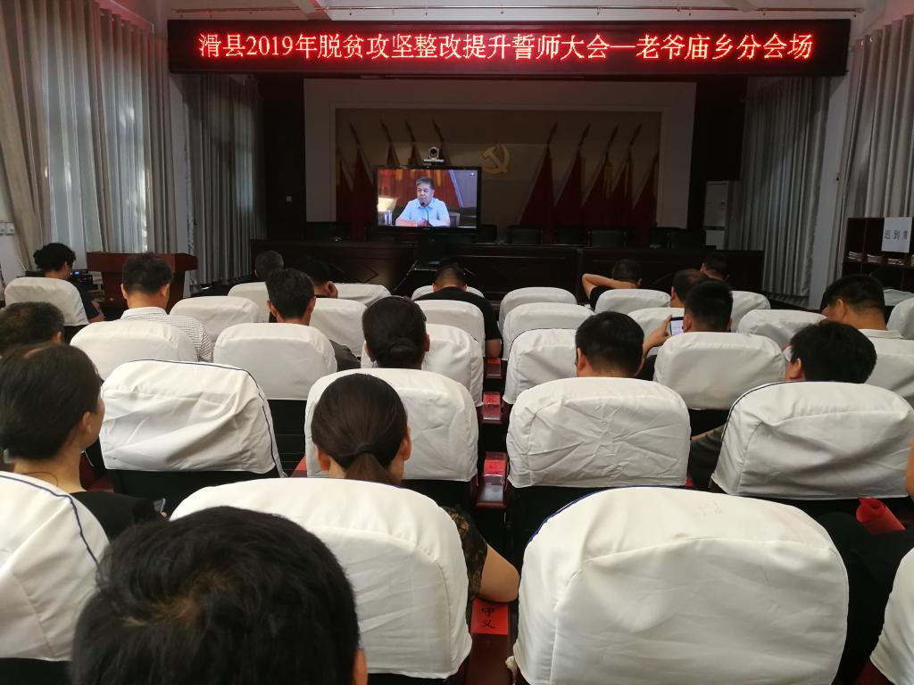 6月18日上午,老爷庙乡机关全体干部、第一书记、村“两委”干部在乡大会议室收听收看了滑县2019年脱贫攻坚整改提升誓师大会。