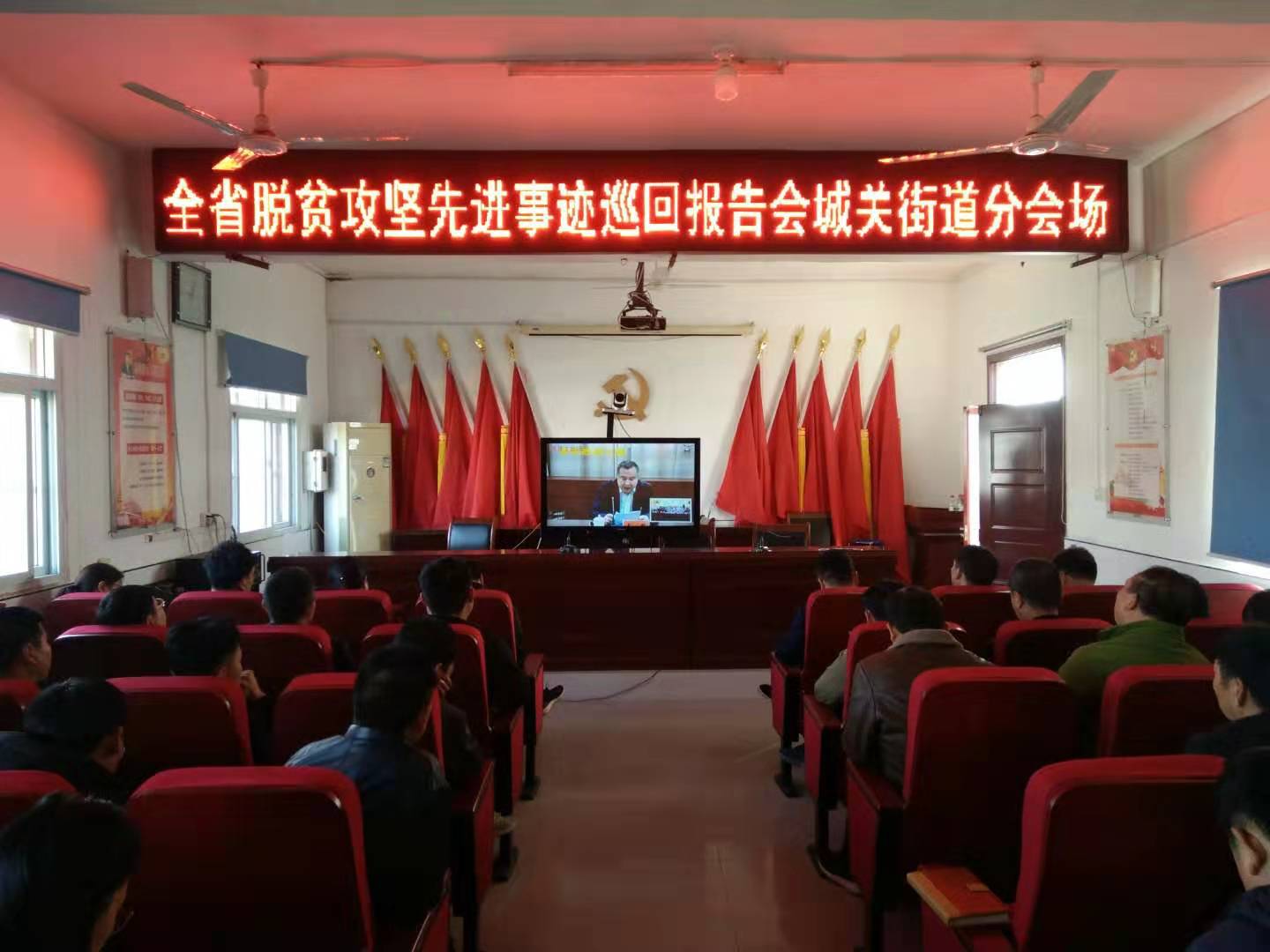 11月10日上午,城关街道组织收听收看全省脱贫攻坚先进事迹巡回报告会。召集机关工作区全体、村支部书记、驻村第一书记、脱贫攻坚指导员、驻村工作队员150余人参加观看。与会人员认真聆听观看了报告团5位成员身处脱贫一线的亲身经历和感人事迹,并详细做了会议记录。