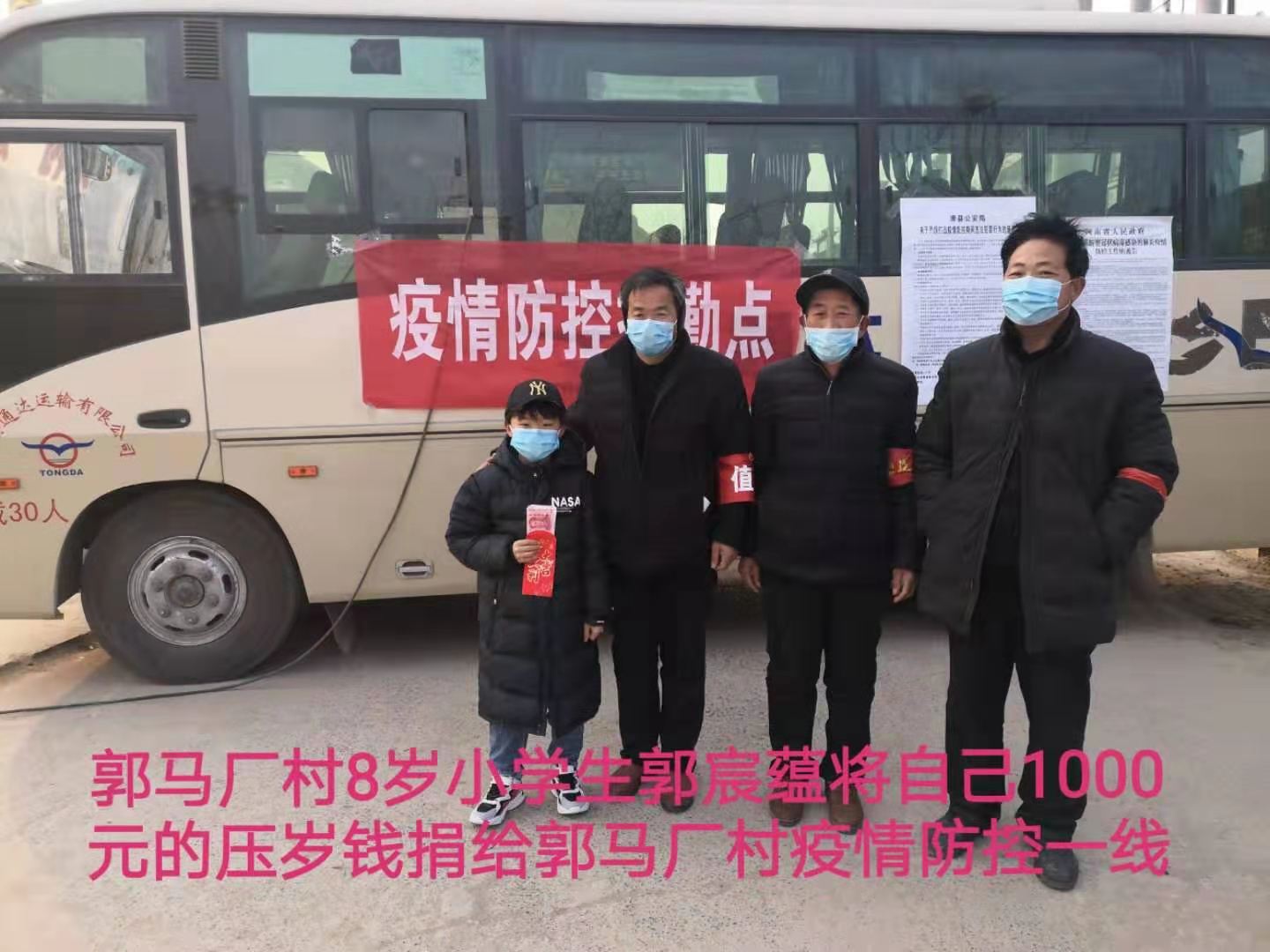 “叔叔阿姨,你们辛苦了,这是我的一点心意,请你们收下。”2月4日,桑村乡郭马厂村防疫执勤卡点来了一名特别的捐款者——年仅8岁的小学生郭宸蕴。