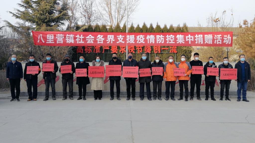 截止目前,八里营镇疫情防控指挥部累计收到社会各界和爱心人士捐赠的善款346371元、口罩38720个、消毒液530斤,以及冲锋衣130套、方便面300箱、火腿肠200箱、牛奶100件、药品20箱。