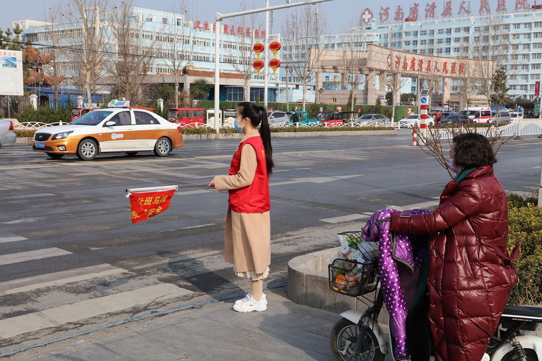 礼让斑马线,从我做起。文明路与英民路交叉路口来往车辆及行人较多,志愿者们分成四组,手举文明劝导旗,向过往的行人和车辆宣传文明出行方式,给行人们营造安全、畅通、文明、有序的交通环境。