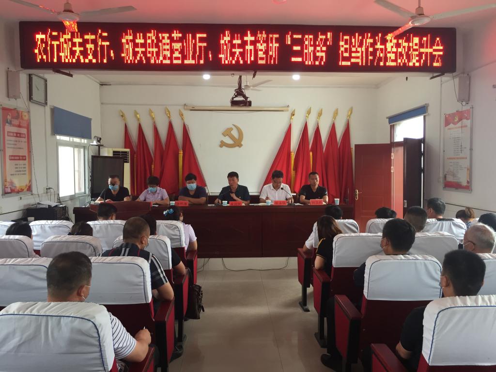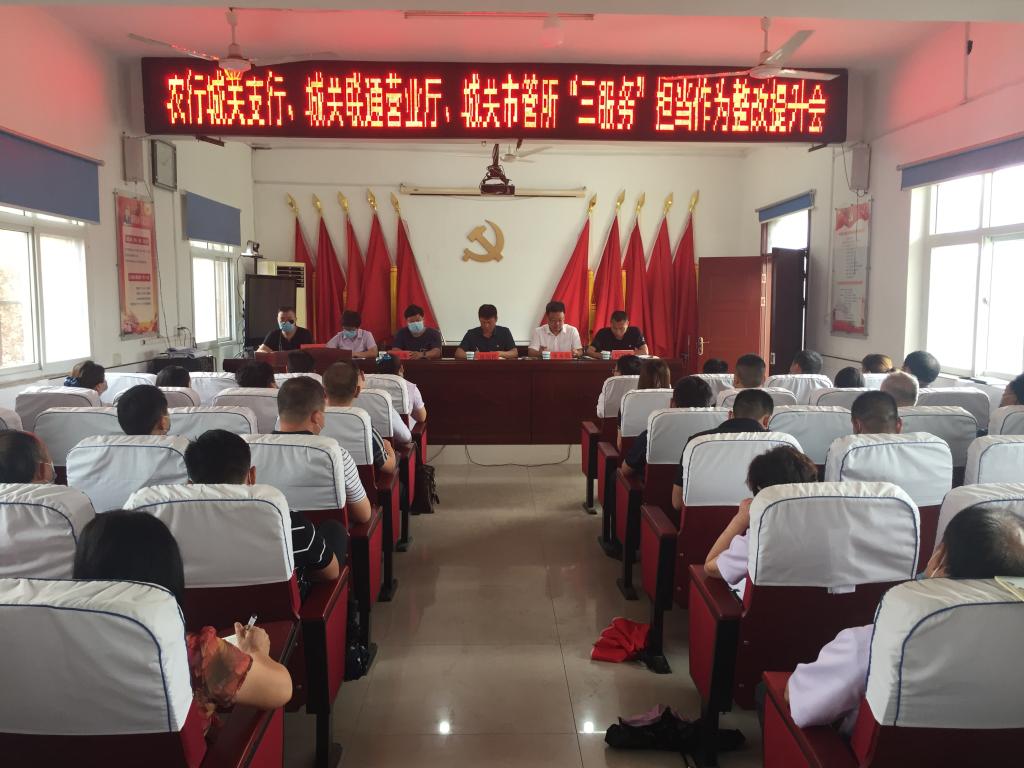 为抓住“三服务”活动契机,动真格、求实效,6月26日,城关街道组织召开了农行城关支行、城关联通营业厅、城关市管所“三服务”担当作为整改提升会,街道领导及3家单位县级领导出席了会议,县级人大代表、政协委员、支部书记代表、企业代表及3家单位所有干部职工参加了此次会议。