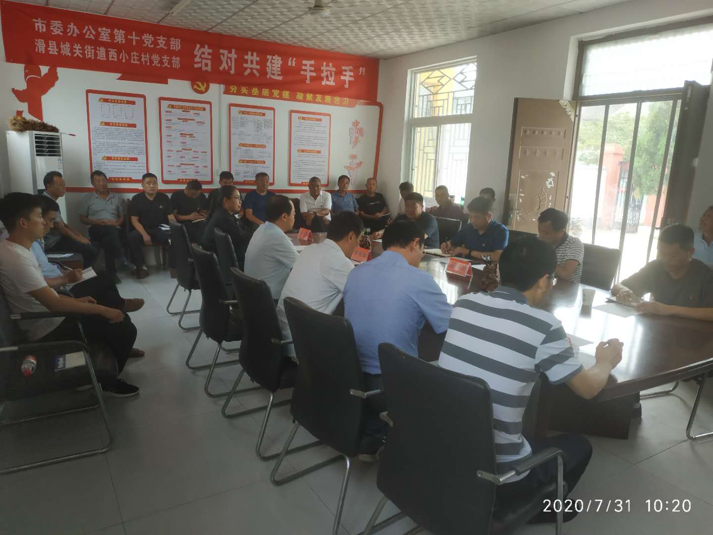 为加强党组织和党员队伍建设,不断增强党支部的凝聚力、战斗力和创造力,努力形成优势互补、双向受益、共同提高的党建工作新格局,7月31日,城关街道西小庄村党支部迎来市委办公室第十党支部,共同开展结对共建“手拉手”主题党日活动,城关街道西小庄村全体党员参加。