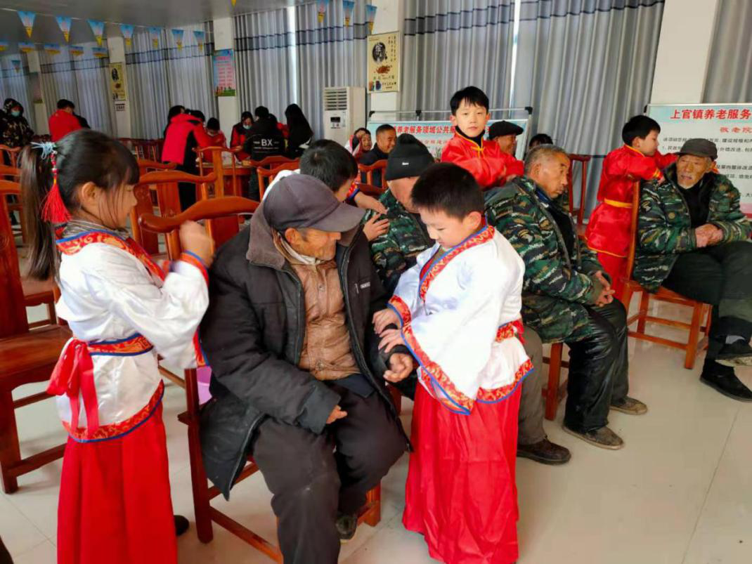 活动现场,志愿者团队不仅在现场同敬老院老人共同包饺子,叙家常,华英小学五年级的孩子还为敬老院老人献唱了《我和我的祖国》歌曲,三年级的孩子表演了《中华武术》,二年级的小朋友表演了手语操《听我说谢谢你》,将活动迅速掀起热潮。表演之余孩子们还不忘问候老人,穿的冷不冷,每天都吃什么饭......懂事的孩子帮助老人捶捶肩,揉揉背,搓搓手,孩子们稚嫩的话语温暖着每一个老人的心。