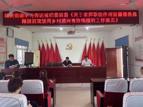 5月26日上午,城关街道组织全体干部职工召开会议,传达省纪委监委《关于发挥职能作用监督服务保障脱贫攻坚同乡村振兴有效衔接的工作意见》文件精神。