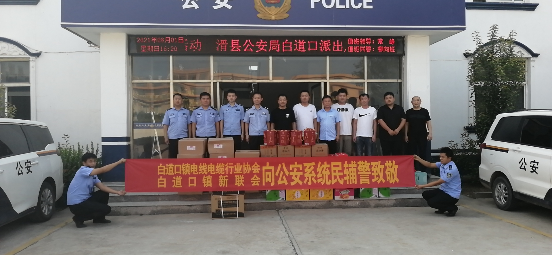 8月1日下午,滑县白道口镇电线电缆行业协会、白道口镇新联会慰问我镇公安干警仪式在派出所院内举行。我镇电线电缆行业协会、新联会部分会员代表向滑县公安局白道口派出所捐赠了一批慰问品及部分防疫物资(口罩、消毒液等)。