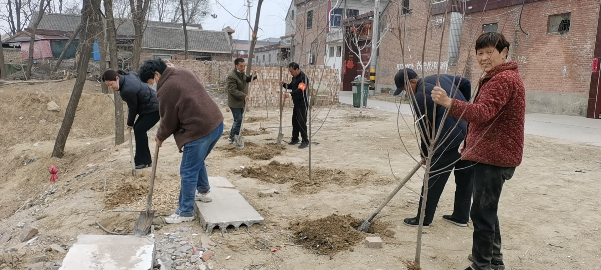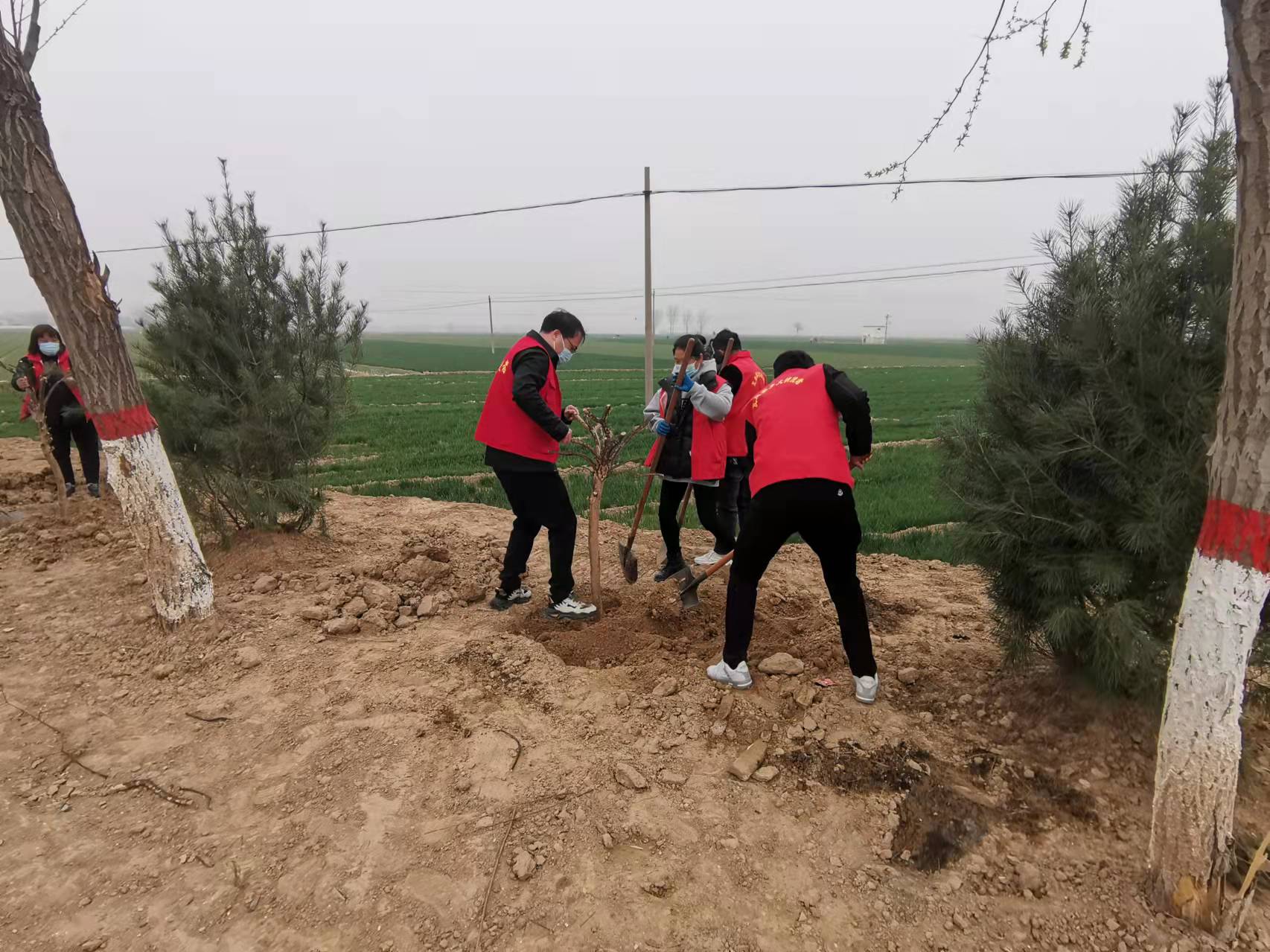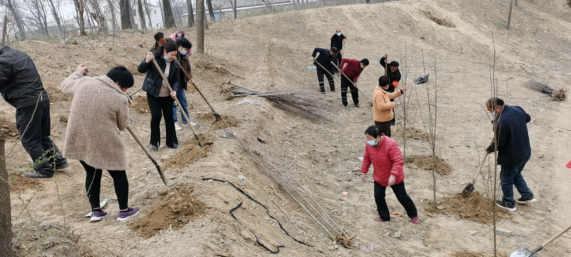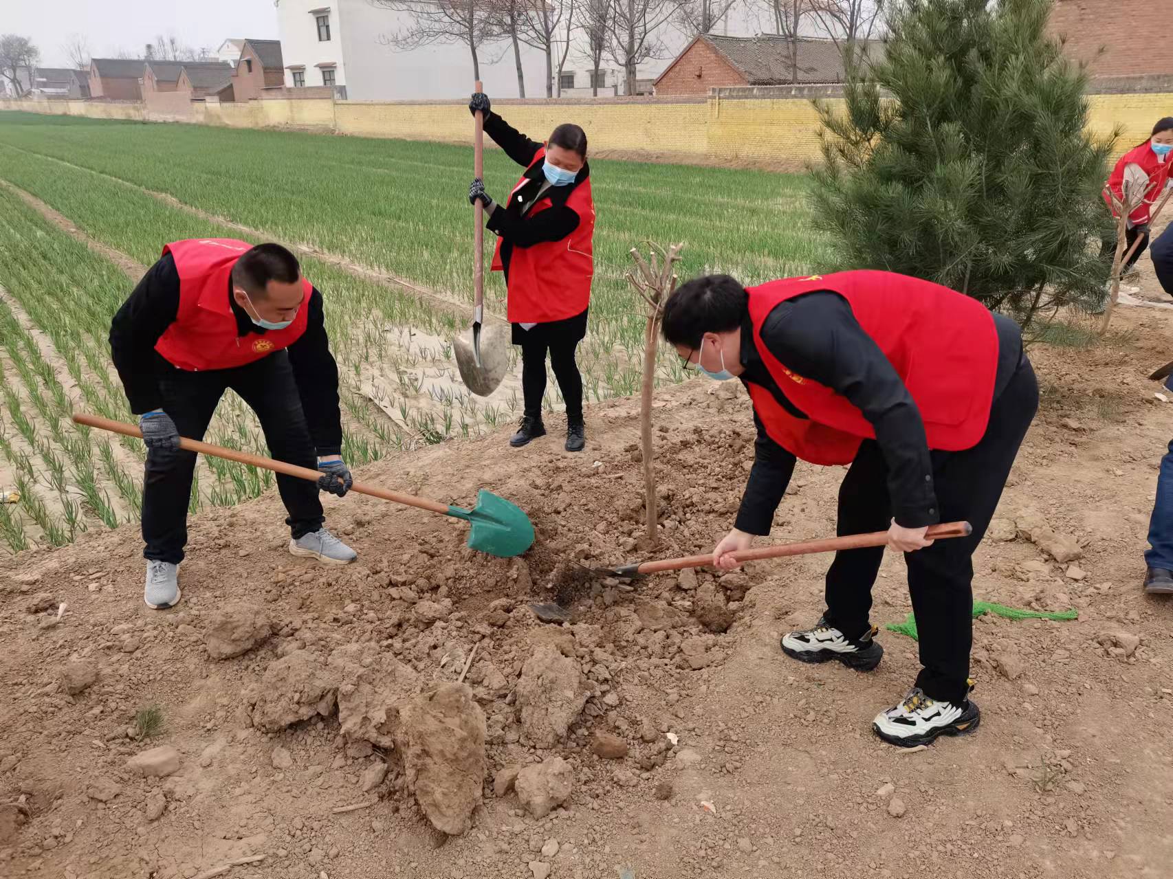 植树现场,乡村两级干部和志愿者们热情高涨,干劲十足,三五人一组,分工合作,挥锹铲土、扶树正苗、浇水培土,栽下一棵棵树苗,为初春增添了活力。