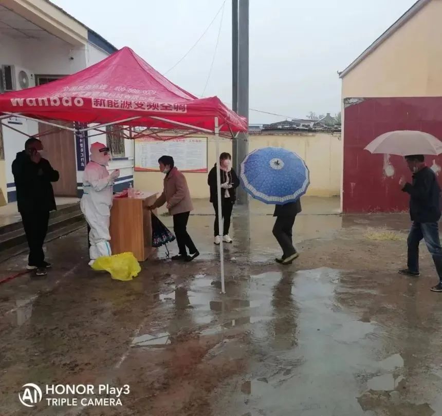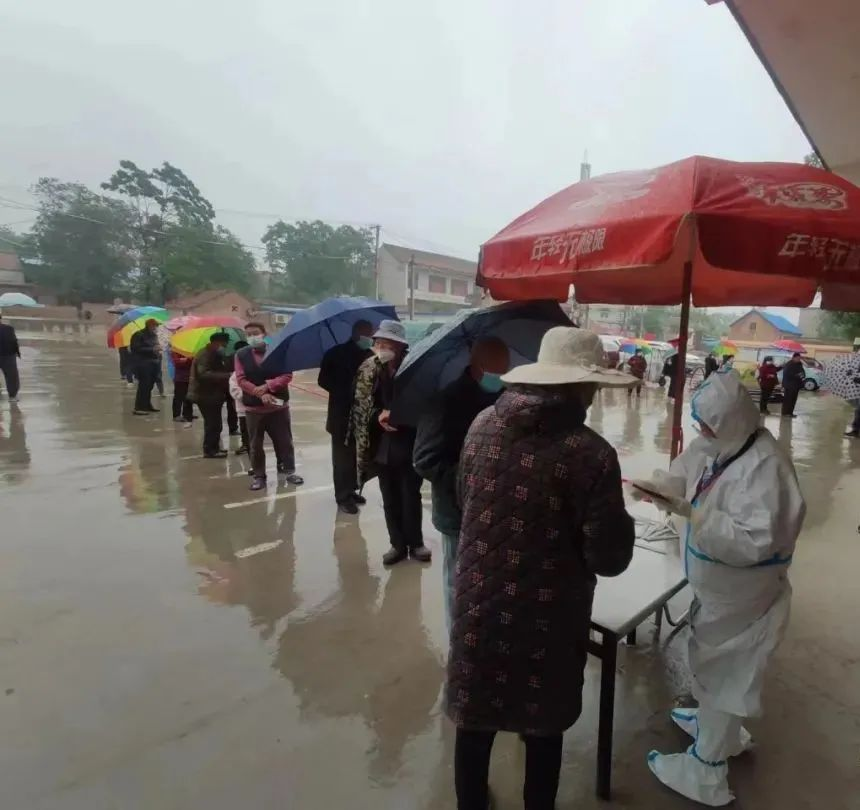 天空正下着细雨,在核酸检测现场,群众在雨中撑着伞,自觉排队坚守一米线,保持安全距离,并提前填好个人信息、准备好二维码和身份证耐心等候采样。