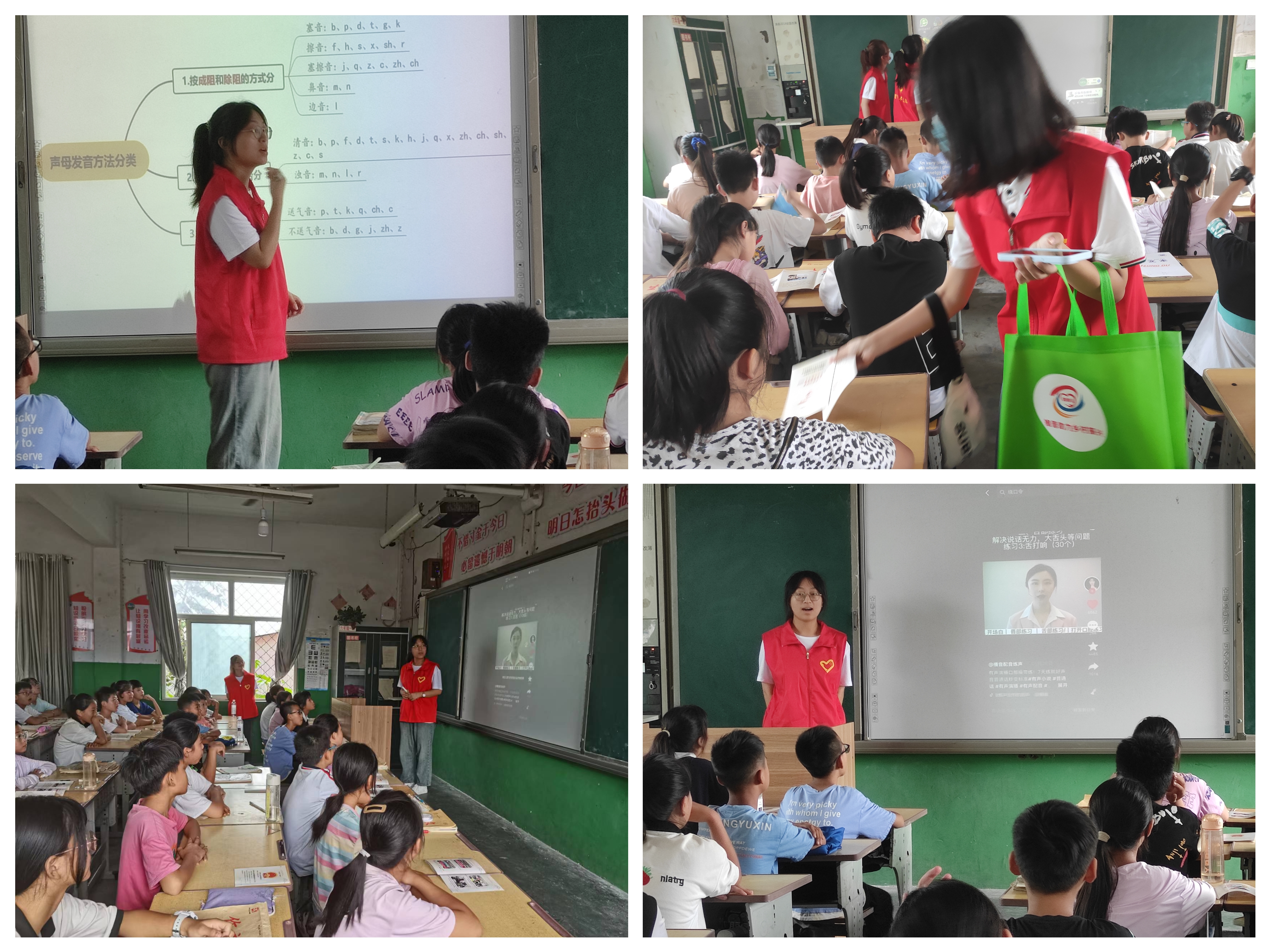经典润童心,推普助成长。服务队来到瓦岗寨乡中心小学开展语言教育活动。在课堂上,大学生志愿者向学生发放普及普通话宣传手册,耐心解答孩子们的疑问,让小朋友们的发音问题在欢声笑语中得到了纠正,发声技巧得到了提高。充分做到了寓教于乐、以娱促学,激发了小朋友们学习普通话的兴趣和热情。