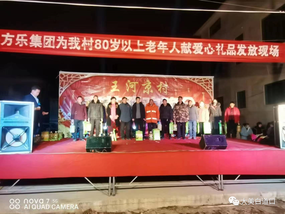 1月20日晚,伴随着开场舞《祖国你好!》,王河京村乡村春晚拉开了序幕,舞蹈、歌曲等多种类型的节目陆续上演,其中歌舞表演《闯码头》、歌曲《夸夸俺的好家乡》《敢问路在何方》赢得了阵阵掌声,戏曲《双上山》更是把晚会推向高潮。精彩的演出让台下群众纷纷拍手称赞,现场气氛十分活跃,群众们表示:这样的演出非常好也非常及时,精彩热闹的表演,一下让“年味”浓了起来。晚会上,方乐集团还现场为王河京村80岁以上的老年人发放了面、油等礼品。