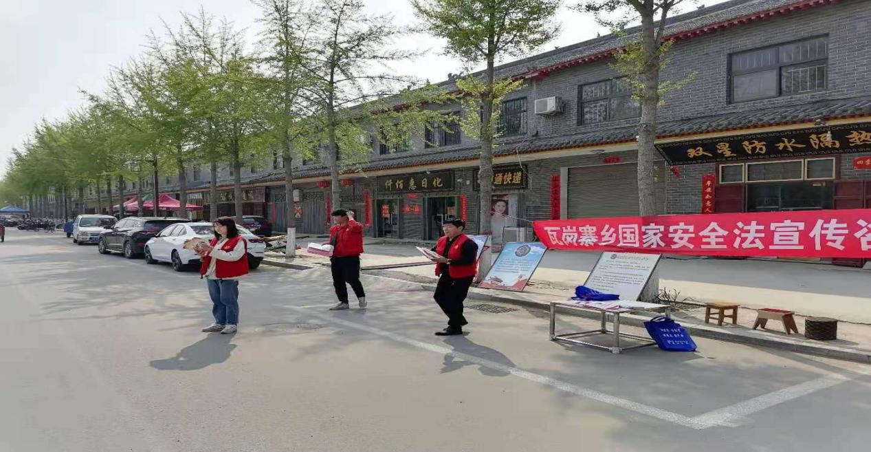 瓦岗寨乡综治办工作人员在集镇区设置咨询台为群众答疑解惑,并向过往群众发放印有国家知识以及《刑法》《反恐怖主义法》《反间谍法》等维护国家安全相关的法律法规宣传单。