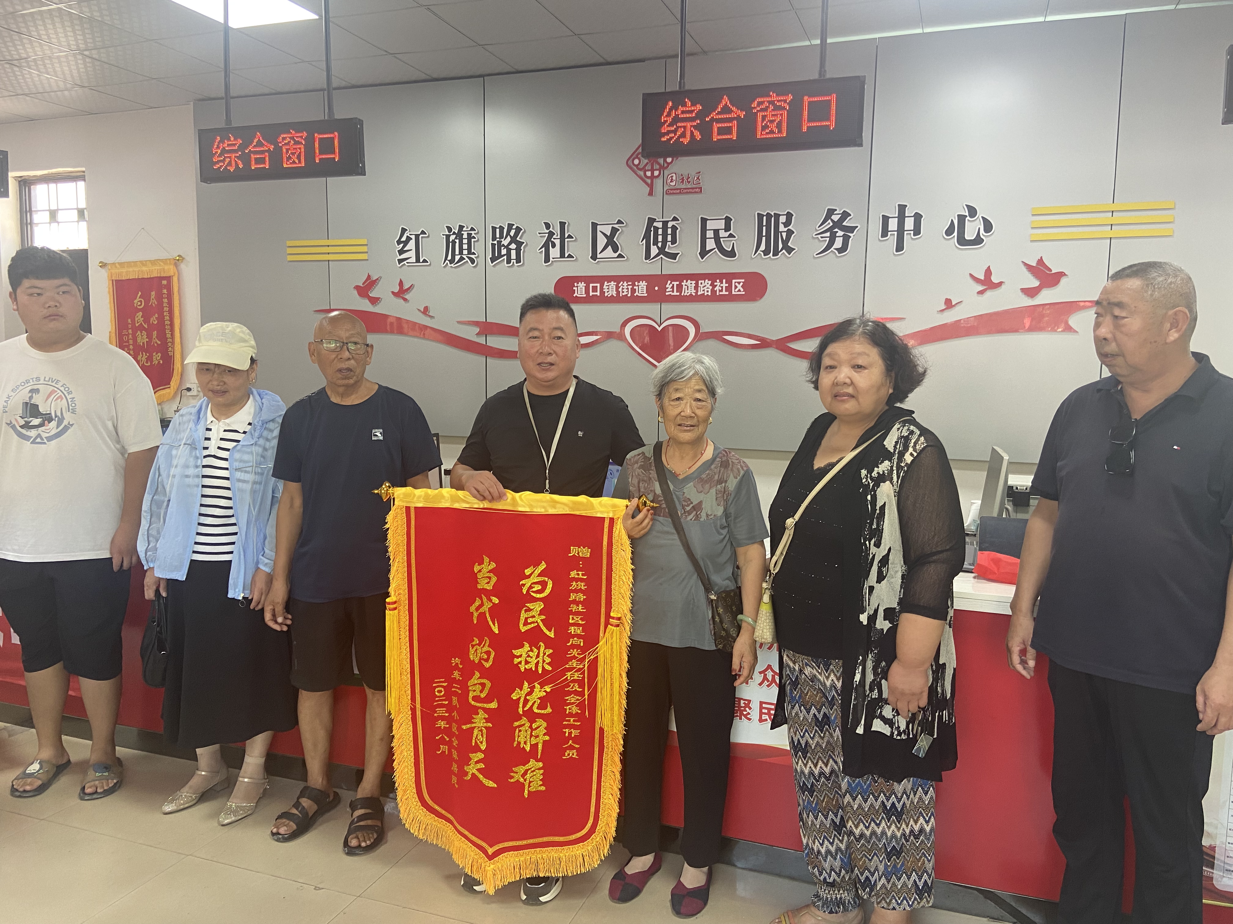 8月3日上午,汽车二队家属院居民代表向道口镇街道红旗路社区赠送了一面写有“为民排忧解难,当代的包青天”的锦旗,感谢红旗路社区拆除违建改善居住环境,解决多年来影响居民通行、存在严重消防隐患的问题。
