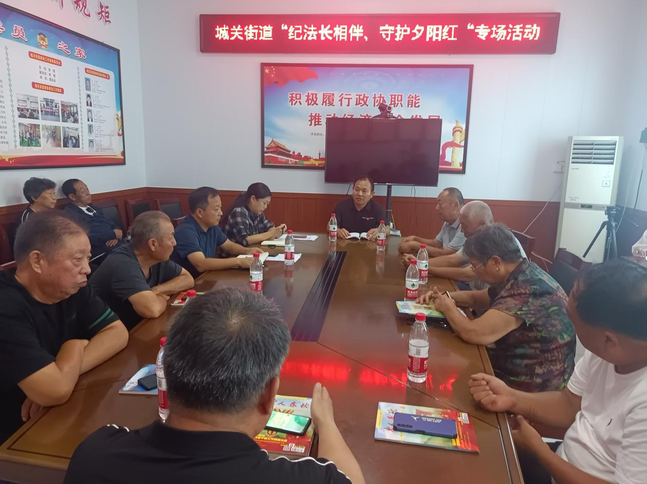 为全面加强党的纪律建设,打造过硬老干部工作队伍,8月29日上午,城关街道开展“纪法长相伴、守护夕阳红”专题教育活动。县委老干局副局长焦赞宽,街道人大工委主任赵本渠,党工委委员、办事处副主任李瑞敏,老干组组长宋文亚及10余名退休党员干部参加活动,检察院、卫健委、交通局等5个单位老干工作负责同志对本次活动进行了观摩。