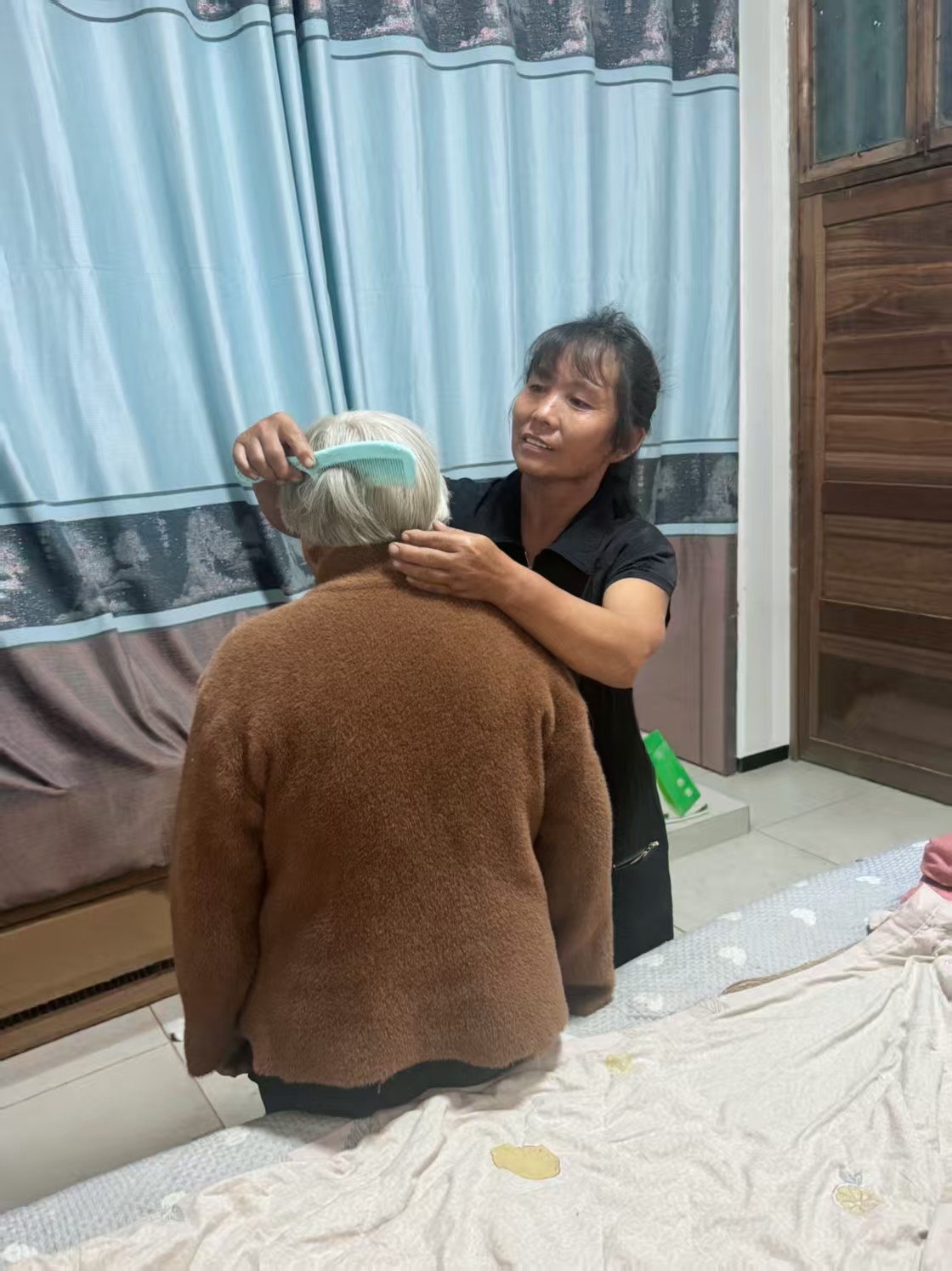每天天还未亮,李松壳的忙碌便已开始。她先回自己家,为丈夫和孩子备好早餐、安顿好起居。随后又马不停蹄赶往娘家,第一时间查看父母的身体状况,熟练地为老人量血压、测体温、递上按时服用的药品。接着照顾弟弟和弟媳洗漱穿衣、准备早餐,遇到二人拒绝进食时,她还会像哄孩子般耐心喂食。