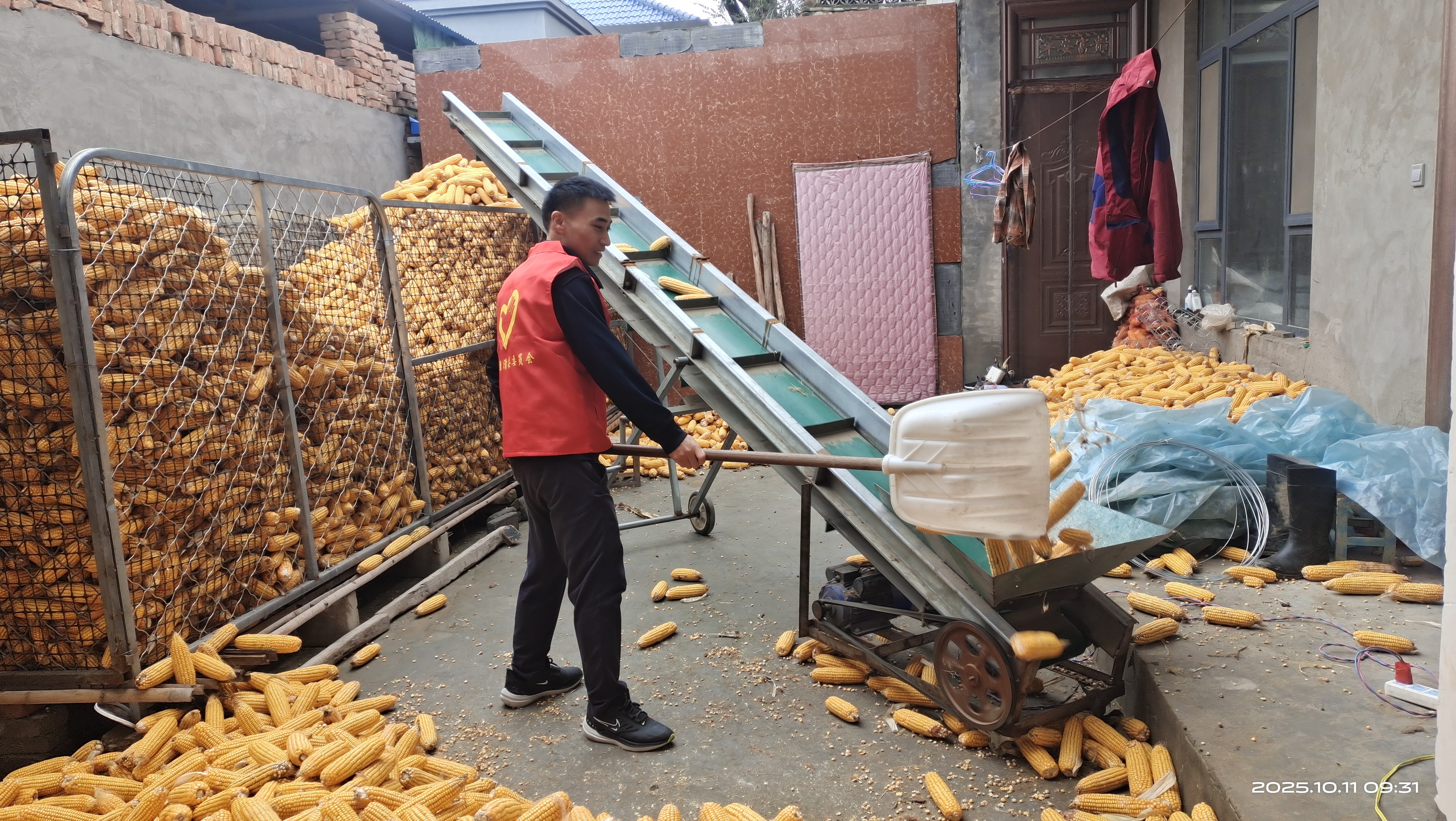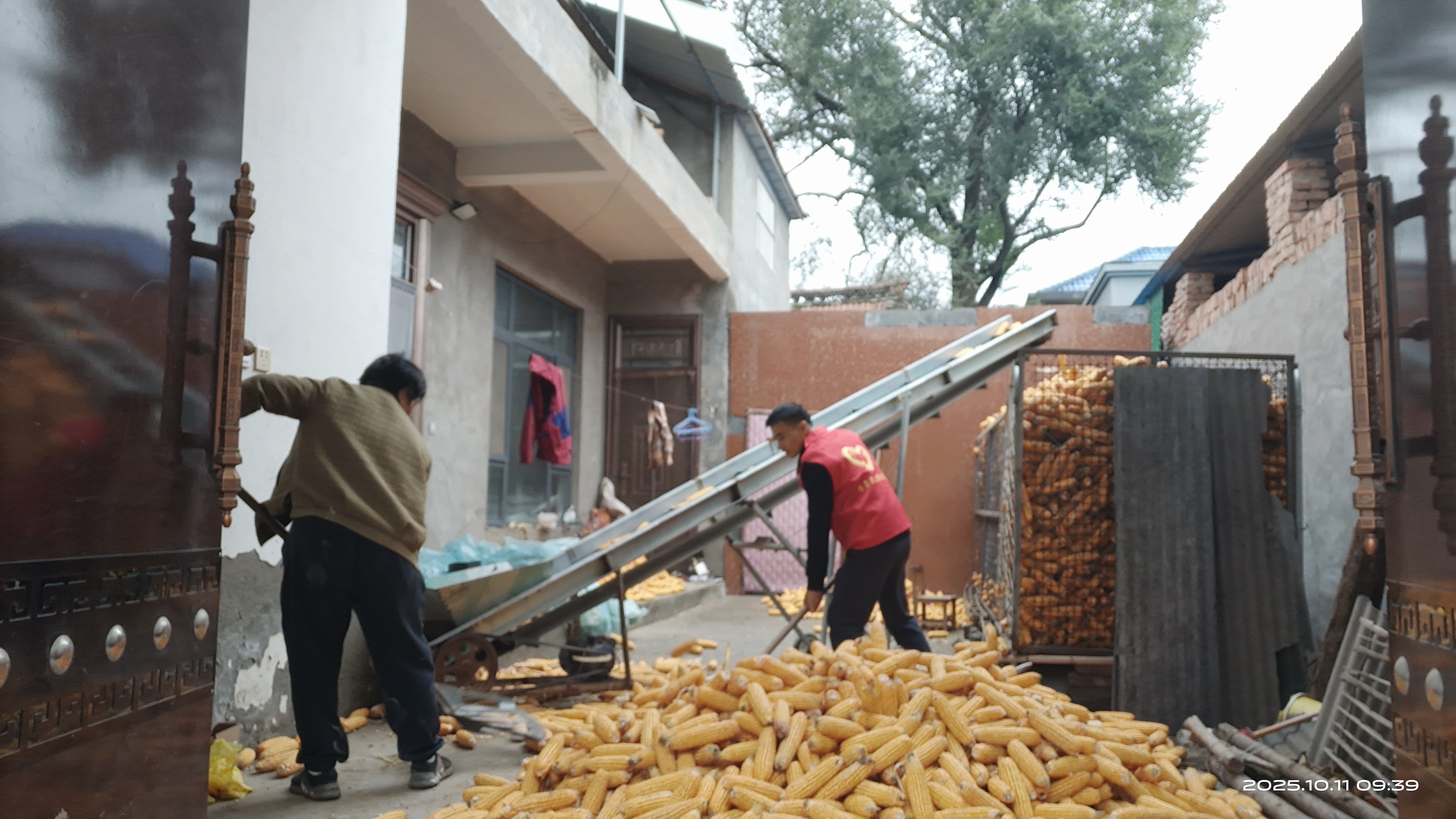 10月12日上午,留固镇沙岗村驻村第一书记张银兵和村干部孔凡勇走进村民柳彦霞家中,拿起木锨,将院落地上的玉米穗通过传送带归拢到玉米笼中。