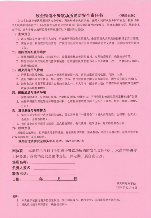 街道严格对标《中华人民共和国消防法》等相关法规,结合辖区实际情况,制定并印发《小餐饮场所消防安全责任书》,明确主体责任、设施配置、用火用电用气管理等六大核心要求,同时细化灭火器配置规范、油烟管道清理频次、应急演练流程等具体标准,通过“责任书+回执联”模式,实现责任签订全覆盖。