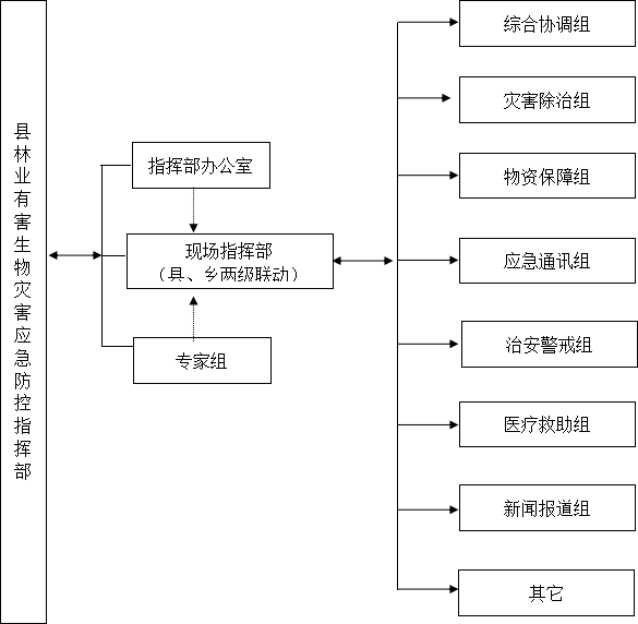 县指挥部成立专家组,主要职责:对林业有害生物灾害进行调查、评估和分析;对应急处置工作的重大决策部署进行科学论证并提供咨询;参与应急处置和现场指挥工作;开展林业有害生物灾害防控相关科学研究;完成县指挥部交办的其他工作。