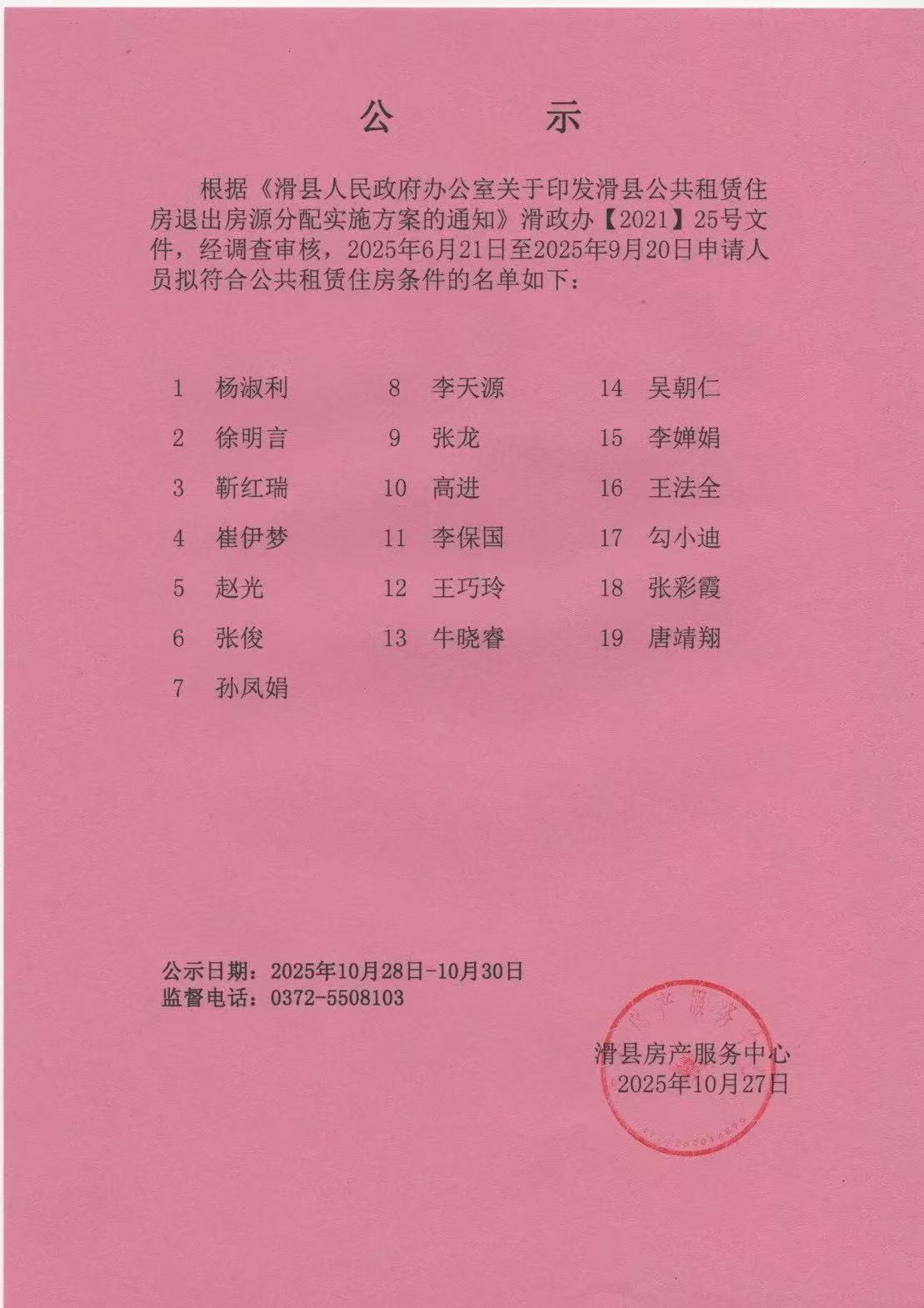 滑县2025年第三季度公共租赁住房申请公示名单