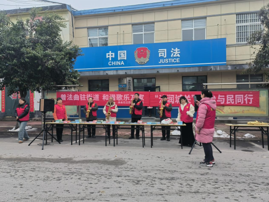 活动现场亮点纷呈,为了打破传统普法的刻板印象,工作人员以文艺表演为载体,萨克斯吹奏表演用悠扬旋律吸引群众驻足,让严肃的普法活动变得生动鲜活;踩高跷、扭秧歌等古会特色表演同步上演,演员们身着特色服饰,腰间系着法治宣传围裙、手中提着普法手提袋,在欢快节奏中载歌载舞,将普法元素与民俗表演深度融合,潜移默化引导群众从“看热闹”转变为“学门道”,为整场活动奠定了热烈欢快的基调。