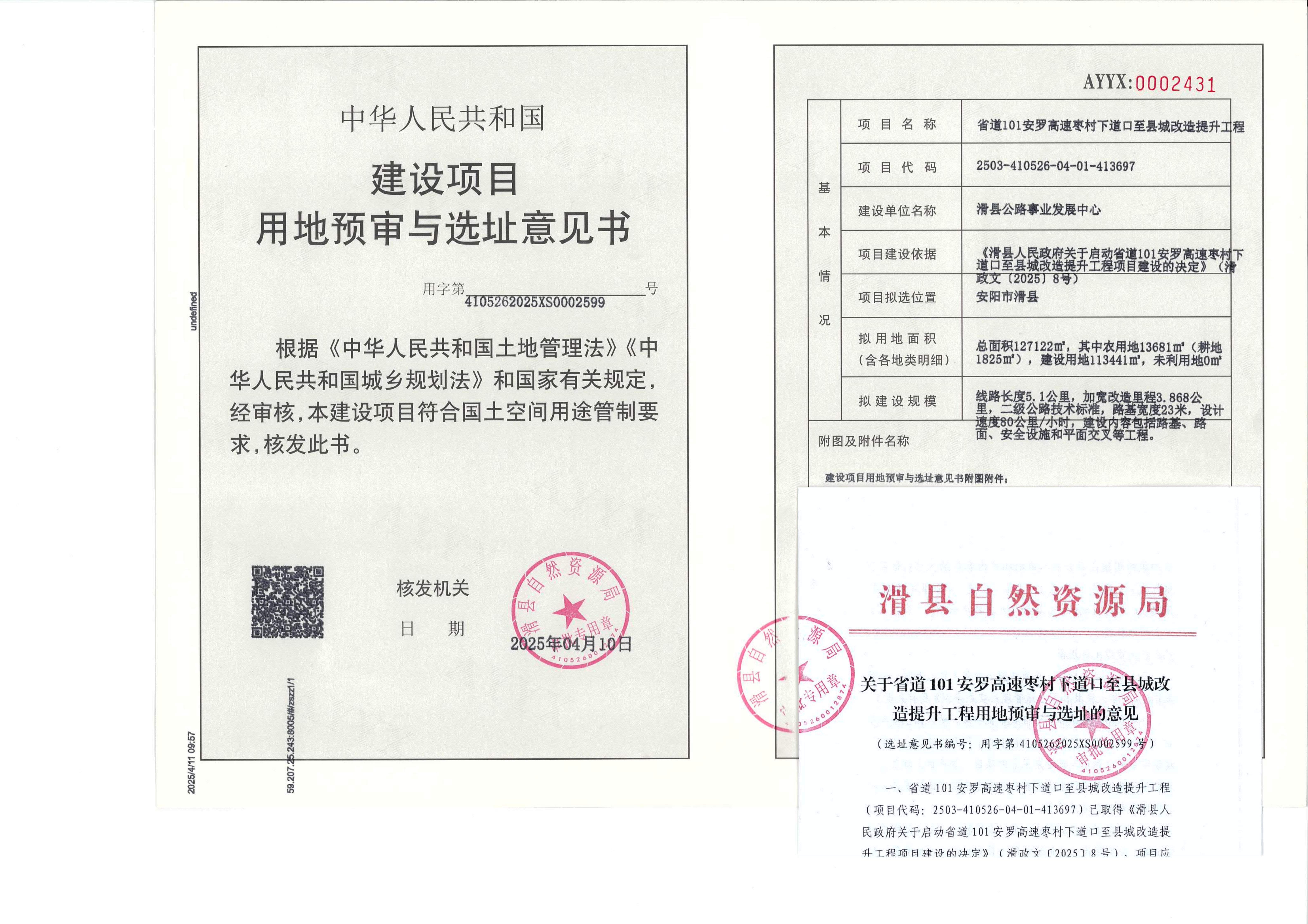 省道101安罗高速枣村下道口至县城改造提升工程建设项目用地预审与选址意见书