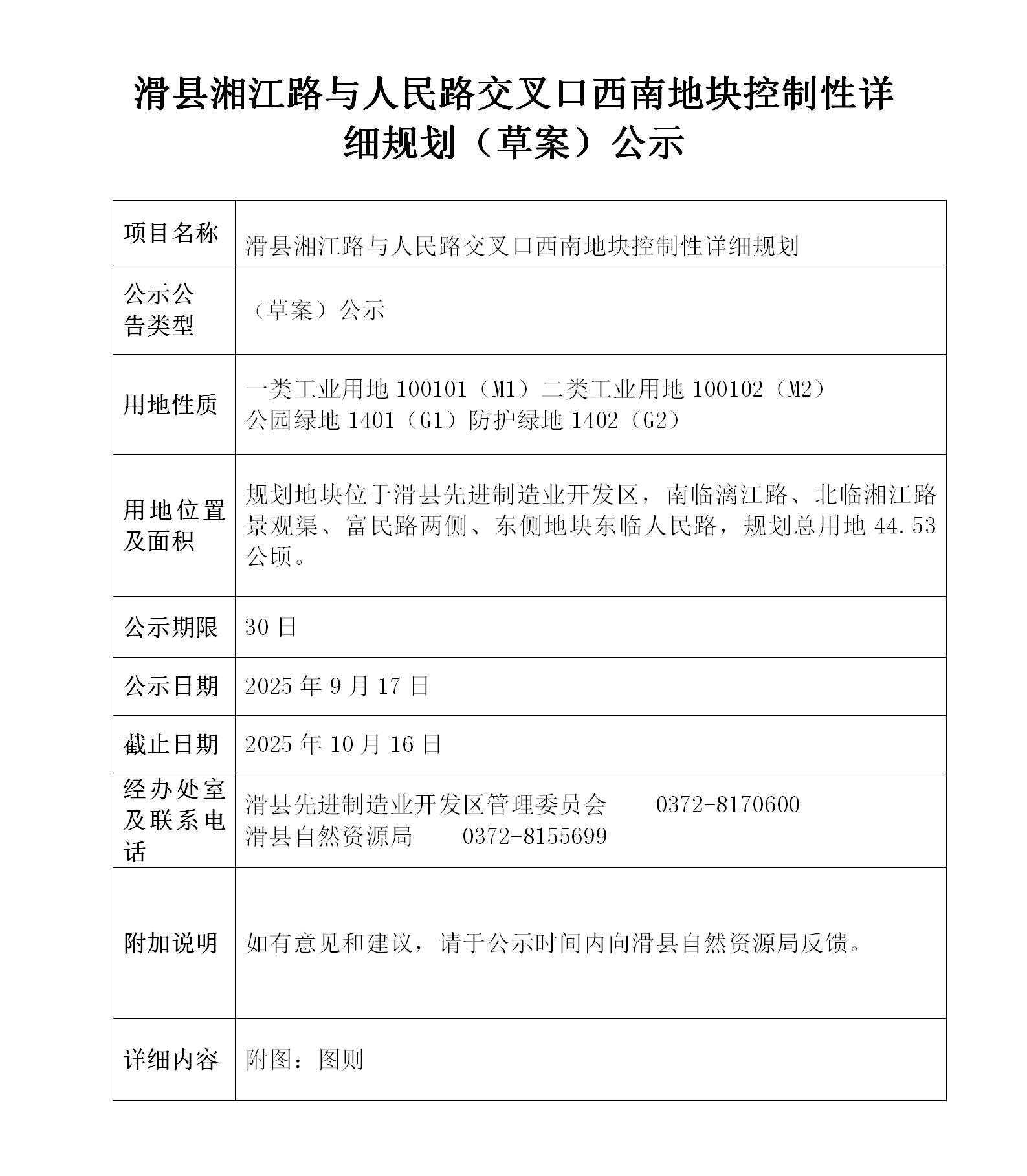 滑县湘江路与人民路交叉口西南地块控制性详细规划(草案)公示