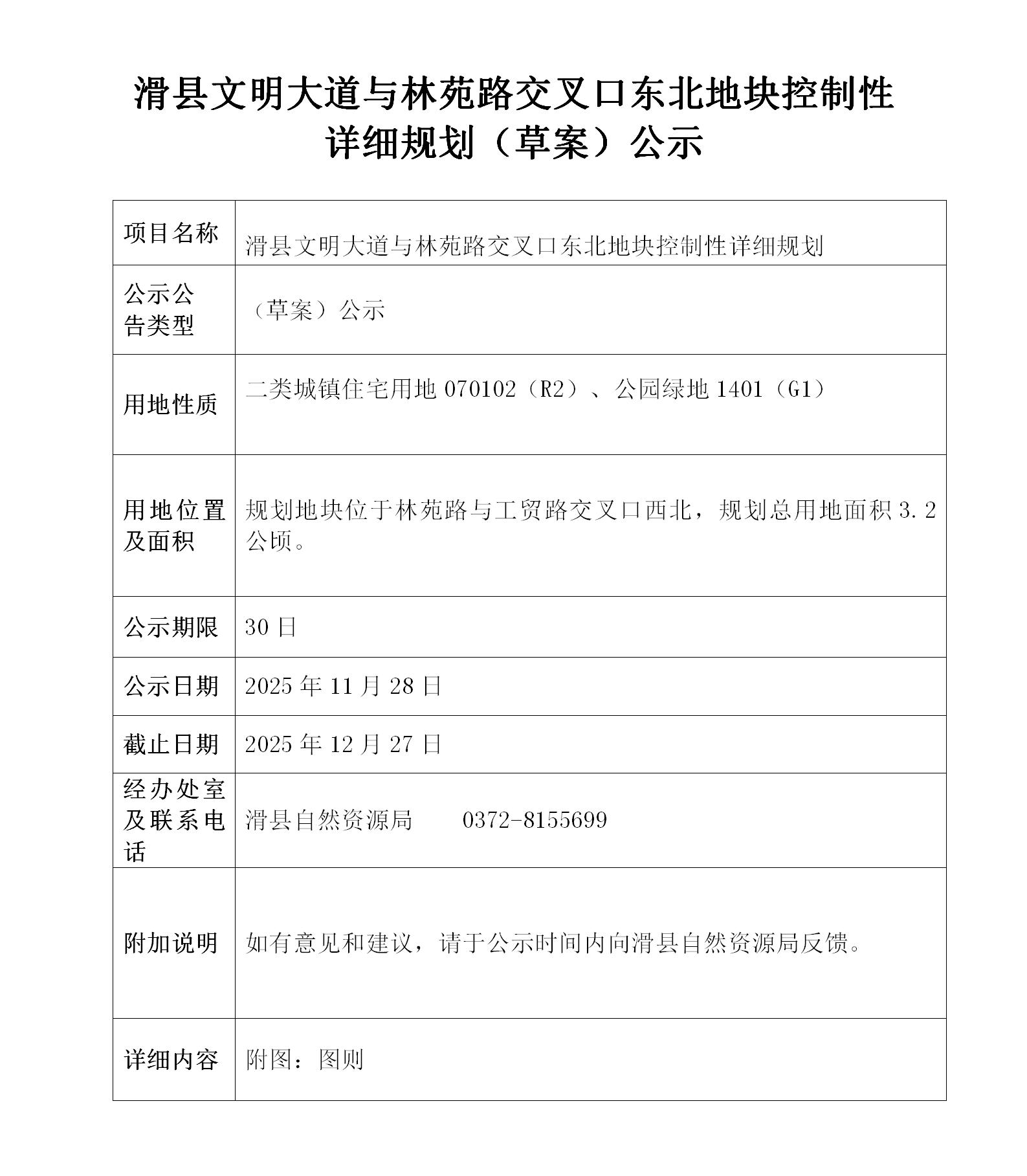 滑县文明大道与林苑路交叉口东北地块控制性详细规划(草案)公示